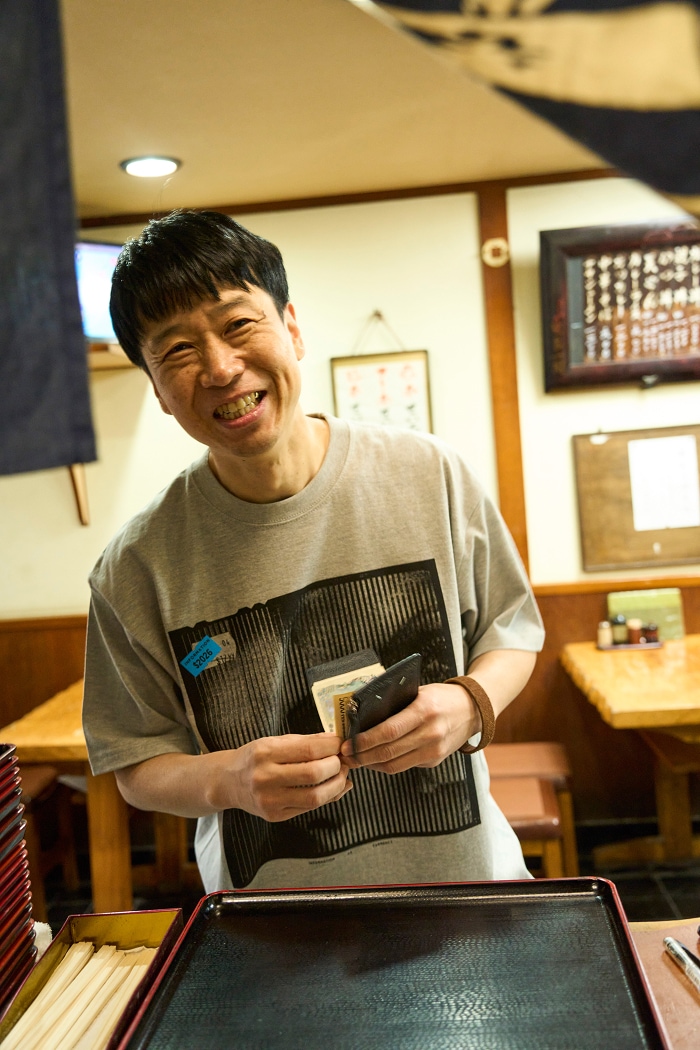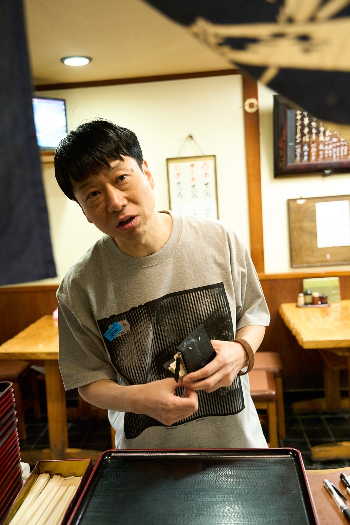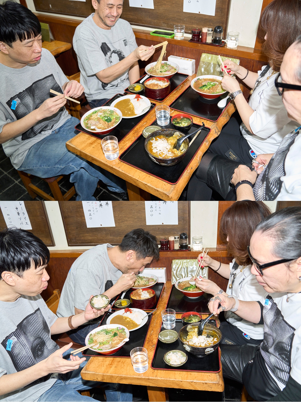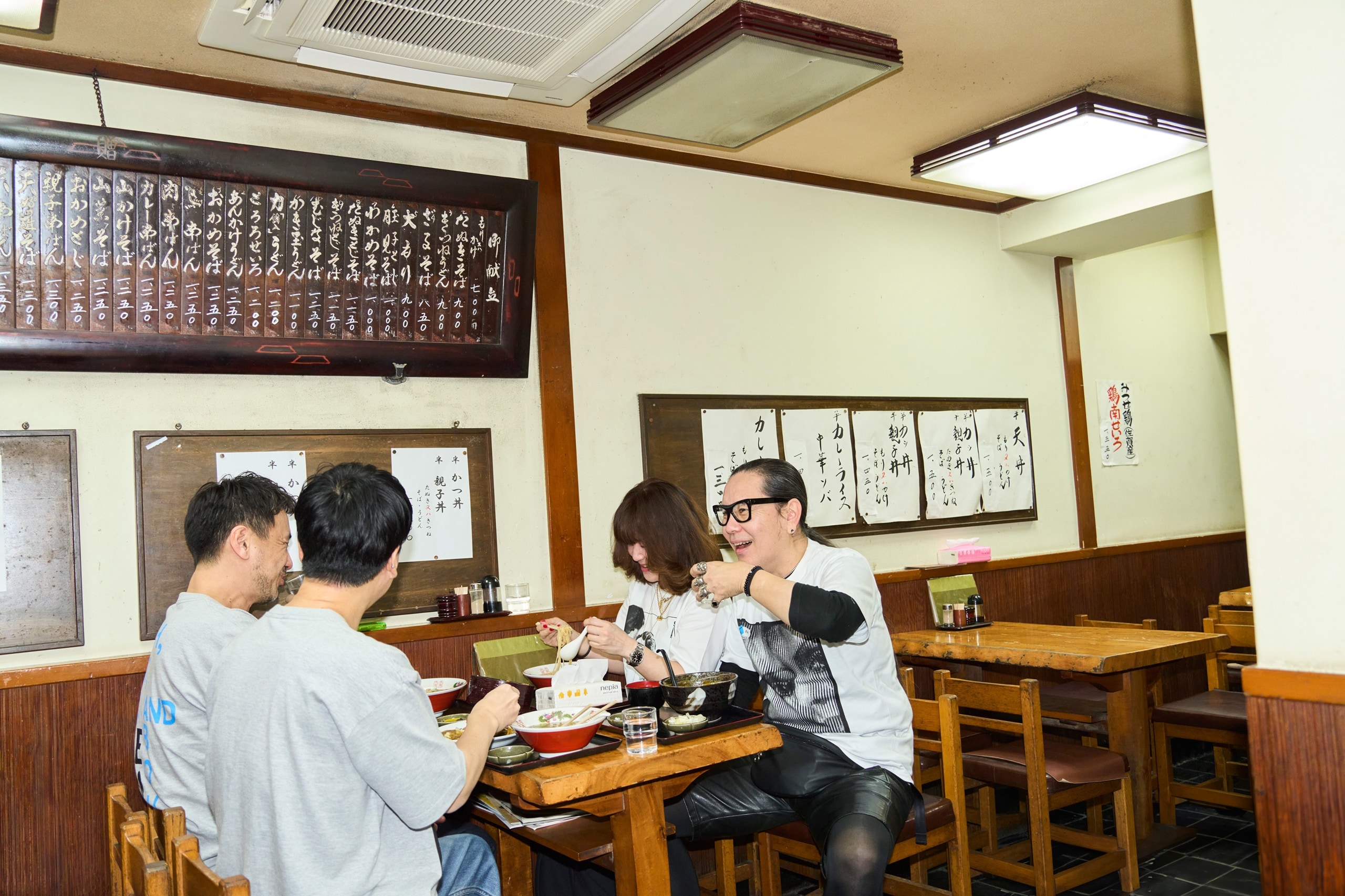 河村康輔(以下、河村)「みんな、昔から遊んでくれている先輩たちです。友達と言うのはおこがましいけど、とにかくすごく大好きな人たち。今回、このコラボのお話をいただいた時、『仲の良い人と一緒にどうですか?』と言われて、パッとこの面々が浮かびました。こういう撮影の場でも、一番気を使わず話せるしワイワイできるので。ただ、普段は仕事の話はまったくしていなくて(笑) 。ただ単に、しょうもないことをずっと言って、笑っている感じです。みんな年上なんですけど、同じ目線で話せる。付き合いは長いんですけど、何を話したか何も覚えていないぐらい、他愛もない話しかしていないですね。ちなみに、今日集まった『ほそ島や』は、行けば必ず誰かしらに会える、ある種、街の溜まり場的な場所なんです。お店の中なんだけど、“ストリート”みたいな感覚のところで撮れたらいいなと思って。ほそ島やの息子さんも僕らの友人ですし、まさに日常の一部のような場所です」