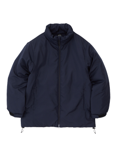 フードタイプの中綿パーカは、シンプルなデザインでどんなシーンにもマッチする万能アイテム。高密度タフタ生地を使用しており、軽量さと上品な光沢感が魅力です。表地はハリ感を出すためアクリルコーティングを施しながら、裏地はあえてコーティングを施さずに肌当たりを良くしました。チンガード付きのフロントジップは、上まで閉めればハイネック仕様であたたかさをキープ。袖口と裾口を絞ることができるため、丸みのあるシルエットに調節できるほか、秋冬の冷たい風の侵入を軽減します。内側の裾部分には、袖まで加工が可能なコンシールファスナーを配し、加工のしやすさも担保しています。