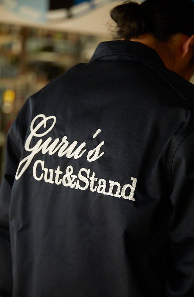 左/コートの襟にはサンセリフ体の抜き文字で“GURU'S”をプリント。中央/ジャケットのバックには、お店のロゴをヴィンテージ感あふれるチェーンステッチ刺繍で大きくシンプルに表現。右/コートのバックプリントは、サロンのアイコンである「グルさん」。デジタルタッチで大胆にデザイン。