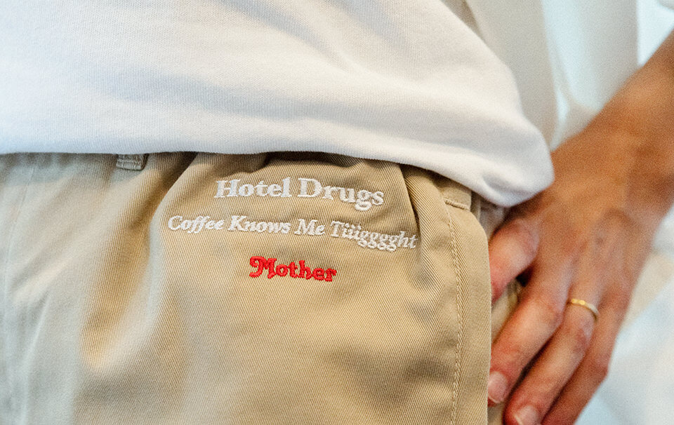 パンツ / 前ポケットの上にシャツと同じ刺繍をオン。クラシカルな書体と少しギャップのあるMotherやSon、Daughterなどの赤いワンポイント刺繍も小粋。